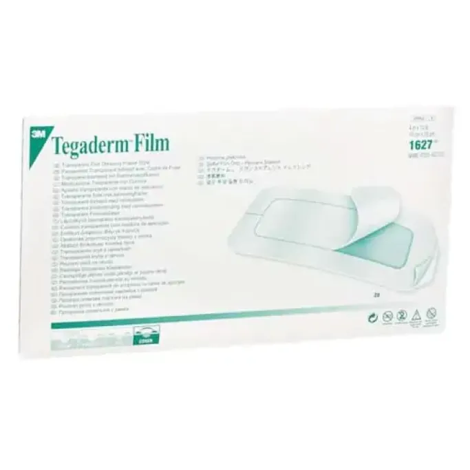 Tegaderm διαφανής αποστειρωμένη μεμβράνη της 3Μ Αποστειρωμένο, διαφανές επίθεμα, επιτρέπει την άδηλο αναπνοή. Τα διαφάνια αδιάβροχα αυτοκόλλητα επιθέματα Tegaderm μπορούν να χρησιμοποιηθούν για την κάλυψη και την προστασία του σημείου της φλεβοκέντησης και των τραυμάτων, διατηρώντας ένα υγρό περιβάλλον για την επούλωση των τραυμάτων και συγκρατώντας τα βοηθήματα στο δέρμα. Ενδείξεις: Αδιάβροχος, αποστειρωμένος φραγμός: προστατεύει το σημείο εισόδου του καθετήρα I.V. ή το τραύμα από εξωτερικούς μολυσματικούς παράγοντες, όπως βακτήρια, ιούς, αίμα και σωματικά υγρά. Δοκιμές in vitro έδειξαν ότι η διαφανής μεμβράνη παρέχει φραγμό προστασίας έναντι ιών διαμέτρου 27 nm ή μεγαλύτερους, κατά το χρόνο που το επίθεμα παραμένει άθικτο χωρίς διαρροή. Το φιλμ είναι διαπερατό στην αναπνοή, επιτρέποντας στο οξυγόνο να εισέρχεται και στους υδρατμούς του δέρματος να εξέρχονται. Το πλαίσιο επιτρέπει την εύκολη και ακριβή τοποθέτηση, ελαχιστοποιώντας την πιθανότητα να κολλήσει το επίθεμα στα γάντια ή με το ίδιο το επίθεμα|| Παρέχει αδιάβροχο, αποστειρωμένο φραγμό από εξωτερικούς μολυσματικούς παράγοντες συμπεριλαμβανομένων υγρών, βακτηρίων και ιών* Η διαφάνεια επιτρέπει την παρακολούθηση των σημείων εισόδου του καθετήρα I.V. χωρίς να είναι απαραίτητο να αφαιρεθεί το επίθεμα Χωρίς λάτεξ Συνιστάται η χρήση αδιάβροχου καλύμματος πάνω από το επίθεμα και το σημείο εισόδου του καθετήρα I.V. κατά τη διάρκεια του ντους Σε 6 μεγέθη: 6εκ. x 7εκ. με 100 τεμ./κουτί6εκ. x 7εκ. με πλαίσιο με 100 τεμ./κουτί 10εκ. x 12εκ. με 50 τεμ./κουτί10εκ. x 25εκ. με 20 τεμ./κουτί15εκ. x 20εκ. με 10 τεμ./κουτί7εκ. x 8,5 με ορατότητα στη περιοχή εισαγωγής I.V. εκ.με 100 τεμ./κουτί..